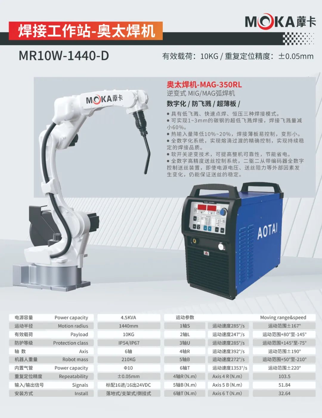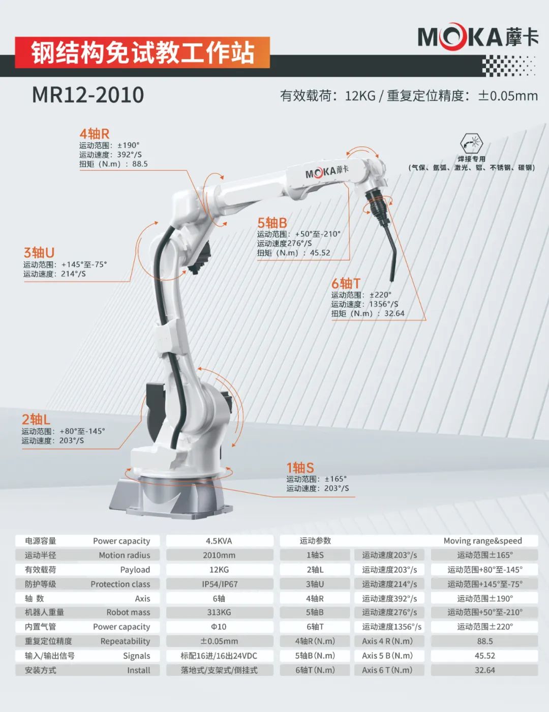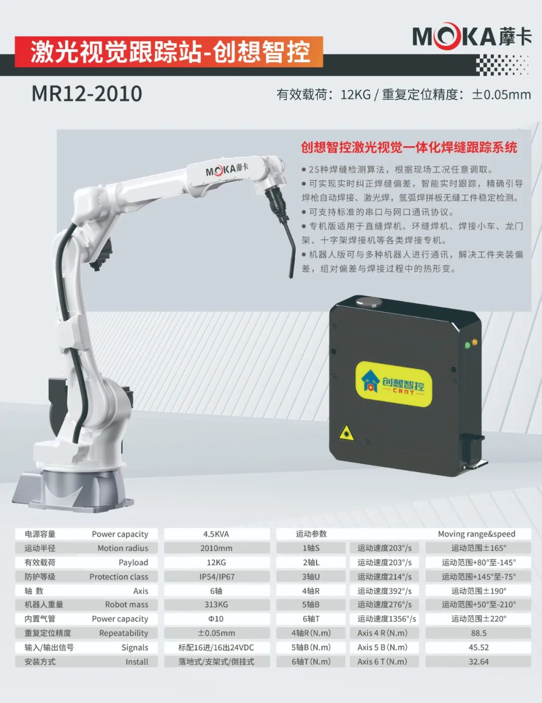 MR12-2010機器人重復定位精度可達±0.05mm,有效載荷為12kg,運動半徑達2010mm,是一款應用于氣保、氬弧、激光、鋁、不銹鋼、碳鋼等領域的焊接專用機器人。
