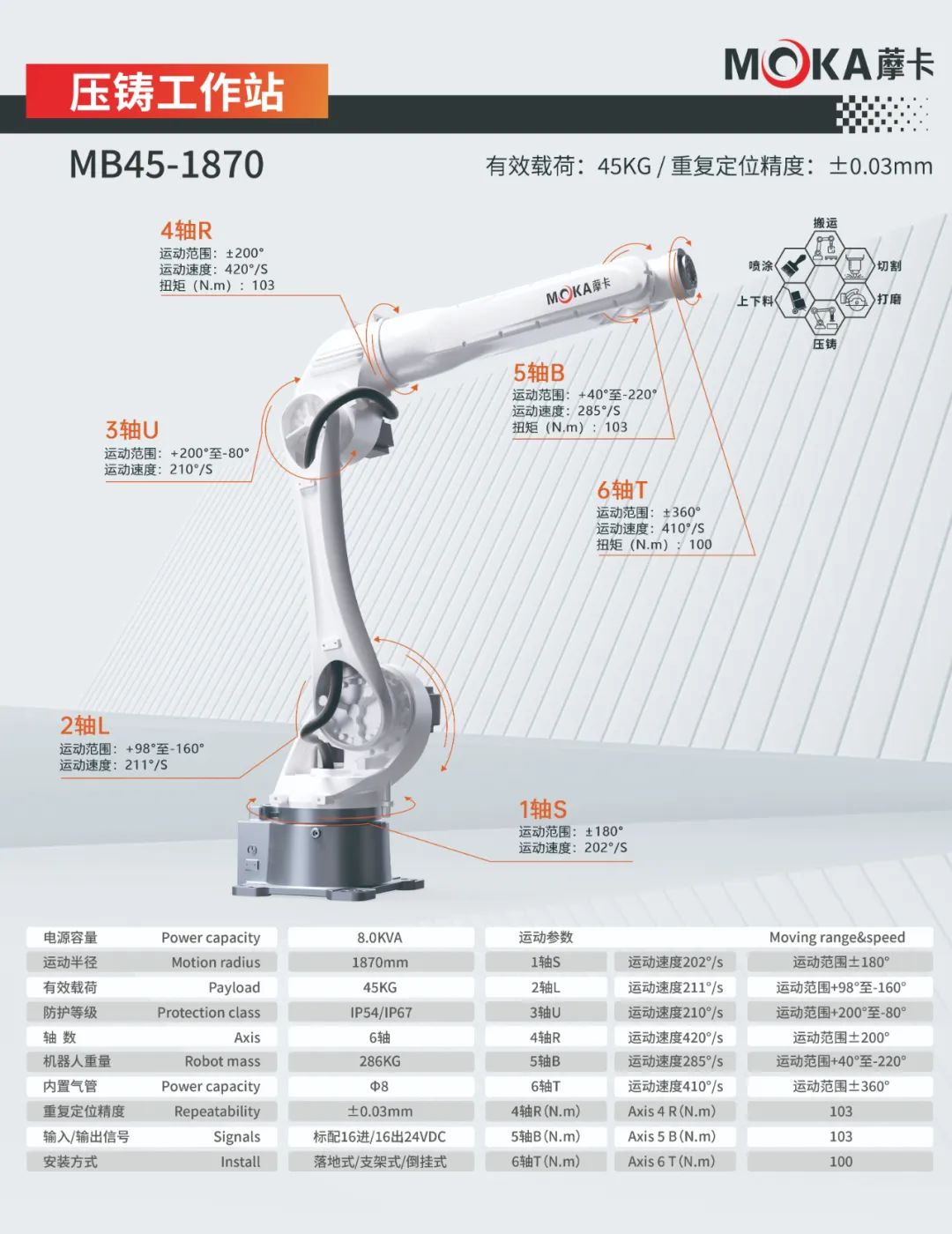 MB35-1870機器人重復定位精度達±0.03mm, 有效載荷35kg,運動半徑1870mm,適用于搬運、噴涂、切割、上下料等應用領域。