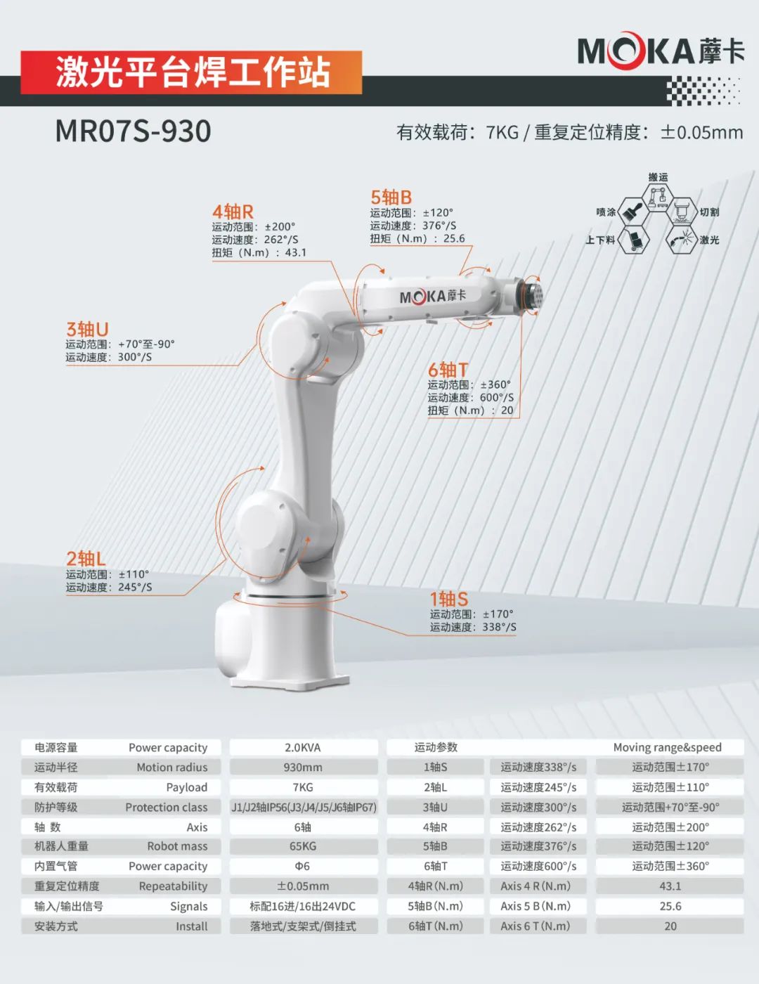 MR07S-930機器人重復定位精度達±0.05mm, 有效載荷7kg,運動半徑930mm,適用于上下料、噴涂、搬運、切割等應用領域。