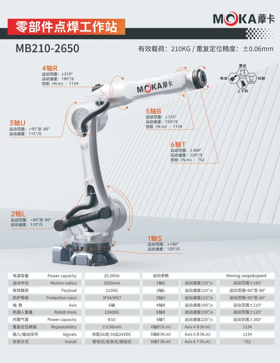 MB210-2650機器人重復定位精度可達±0.06mm,有效載荷為210kg,運動半徑達2650mm,是一款應用于搬運、噴涂、切割、上下料等領域的大負載機器人。