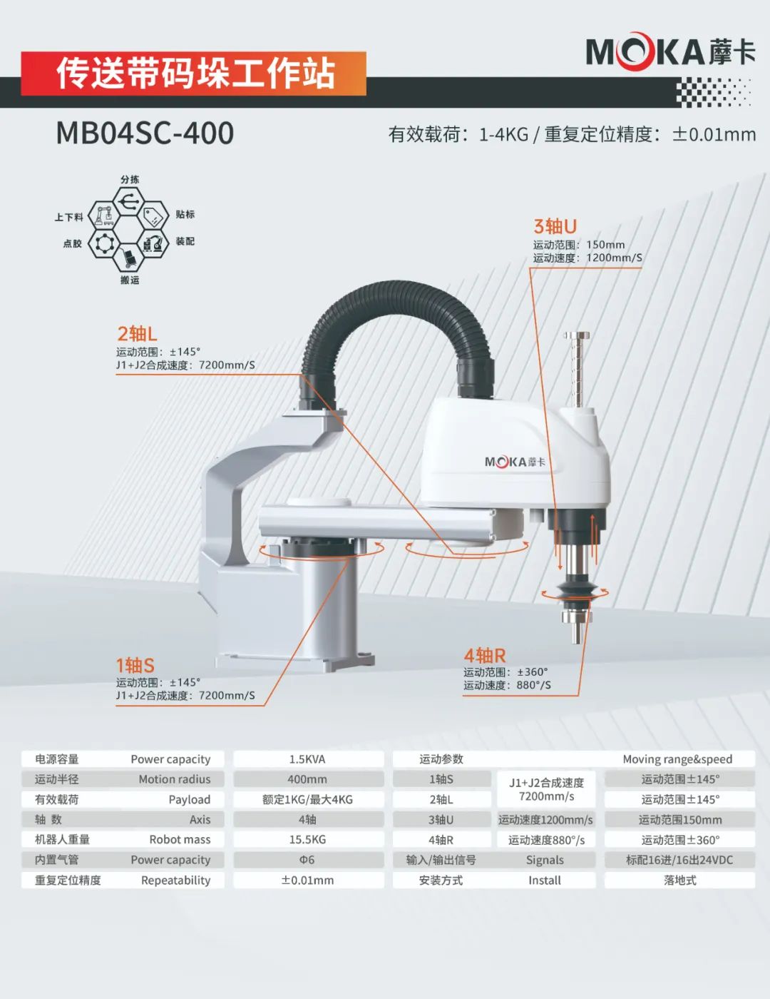 MB04SC-400機器人重復定位精度達±0.01mm, 有效載荷4kg,運動半徑400mm,適用于分揀、上下料、點膠、貼標、裝配、搬運等應用領域。